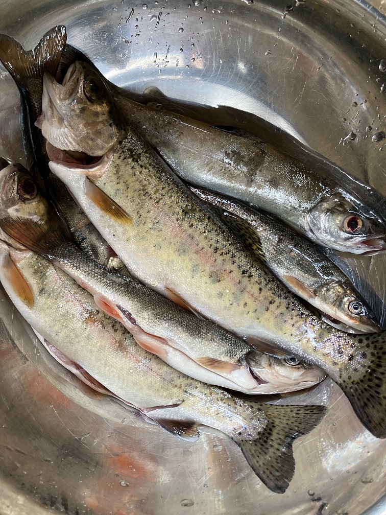 17時になっても帰ってこないので心配したが大きいニジマスを8匹釣って帰ってきた。