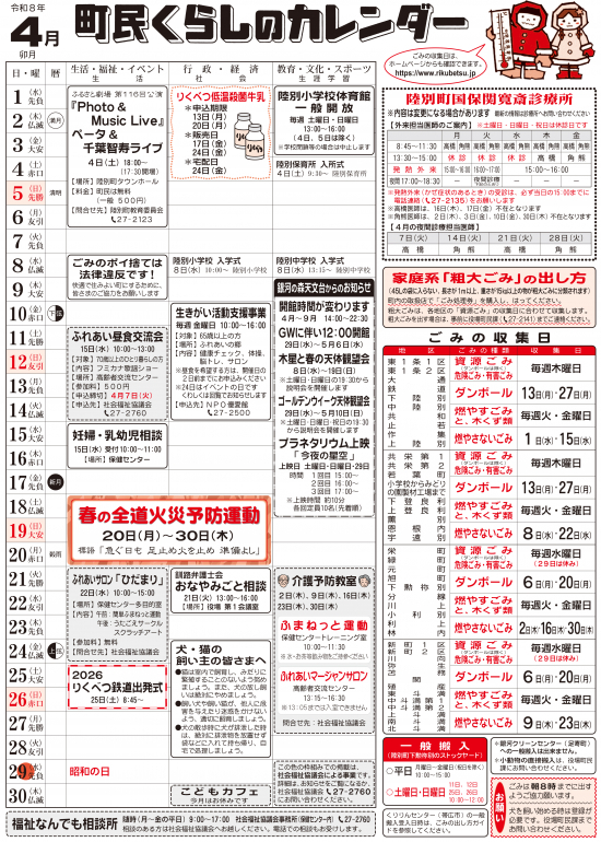 くらしのカレンダー 最新号 2026年4月 *画像をクリックするとPDFファイルがひらきます。 バックナンバー 2026年(令和08年) 2025年(令和07年) 2024年(令和06年) 2023年(令和05年) 2022年(令和04年) 2021年(令和03年) 2020年(令和02年) 2019年(令和01年) 2018年(平成30年) 2017年(平成29年) 2016年(平成28年) 2015年(平成27年) 2014年(平成26年) 2013年(平成25年) 2012年(平成24年) このページの情報に関するお問い合わせ先 町民課 広報広聴・統計担当 電話番号:0156-27-2141内線:118FAX:0156-27-2797