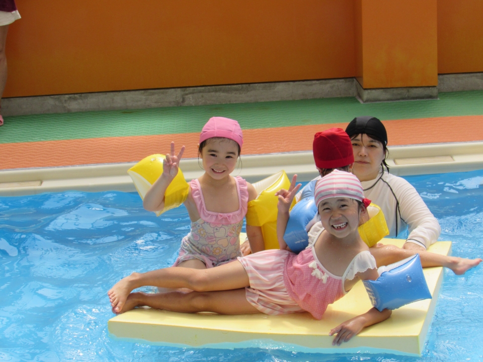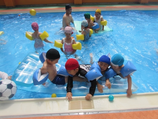 7月19日から全10回年長児水遊び教室が行われました。浅いプールでボール取りや水の中に沈んだ玉ひろいをして水に慣れた後、深いプールで腕に浮き輪をつけてバタ足泳ぎの練習をしました。8月6日に記録会が行われ25メートルバタ足で頑張って泳ぎました。子ども達は、「プール楽しい」「もっとやりたい」と毎回の水遊び教室をとても楽しんで参加していました。