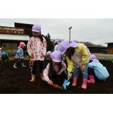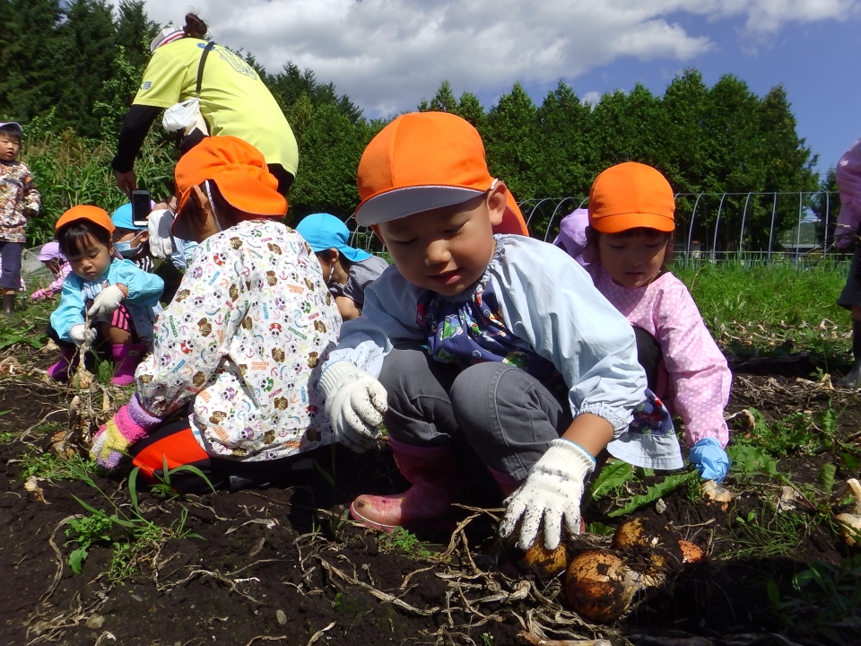 9月6日・10月3日に給食センターの畑へ収穫体験に行きました。両日ともぞうぐみときりんぐみが参加、6日はうさぎぐみも参加しました。人参・タマネギ・ジャガイモ・長ネギ・収穫をしました。人参をたくさん抜いて、「重い~」と言いながら担いでいましたよ。収穫したものを頂き子ども達は喜んで帰ってきました。後日給食のメニューにも使用されるそうです。