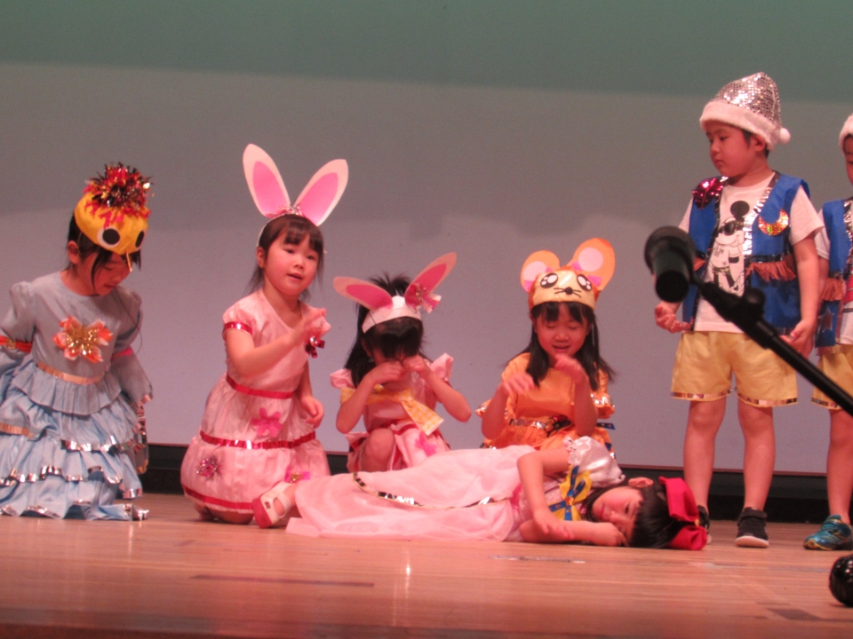 12月9日、町タウンホールで生活発表会が行われました。年長児きりんぐみの器楽で始まり、各クラス劇と遊戯を行いました。