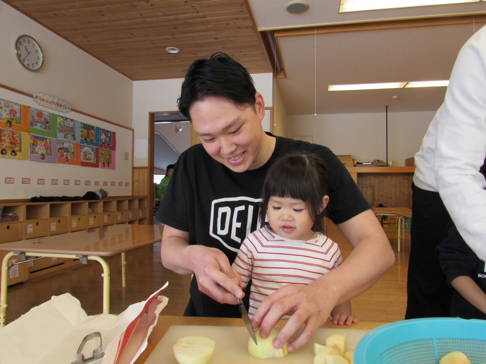 2月24日、本年度2回目のお父さん会が行われました。今回のテーマは「お父さんと一緒に遊ぼう」でした。14組の親子が参加し、カレーライスをお父さんと一緒に作りました。じゃがいも・人参・玉ねぎの皮むきを親子で行い包丁を使って切りました。お父さんの見事な包丁さばきも見ることができましたよ。終了後は、外で雪中レクを行いました。そりリレーや宝探しを楽しみ、保育所お遊戯室でみんなでカレーライスを食べました。