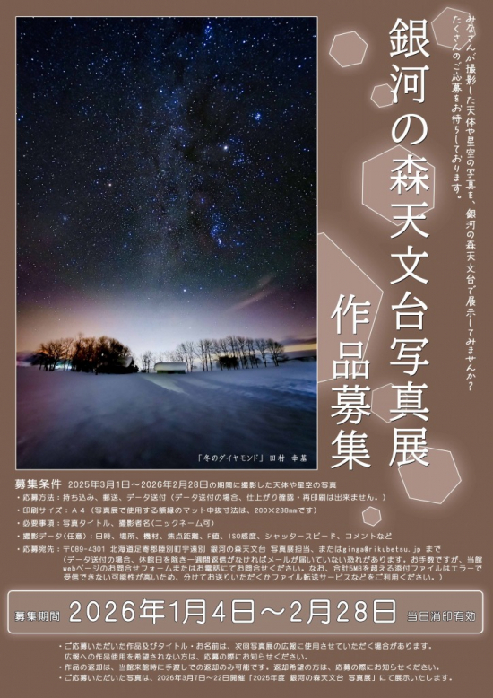 郵送先:〒089-4301 北海道足寄郡陸別町宇遠別 銀河の森天文台 写真展担当